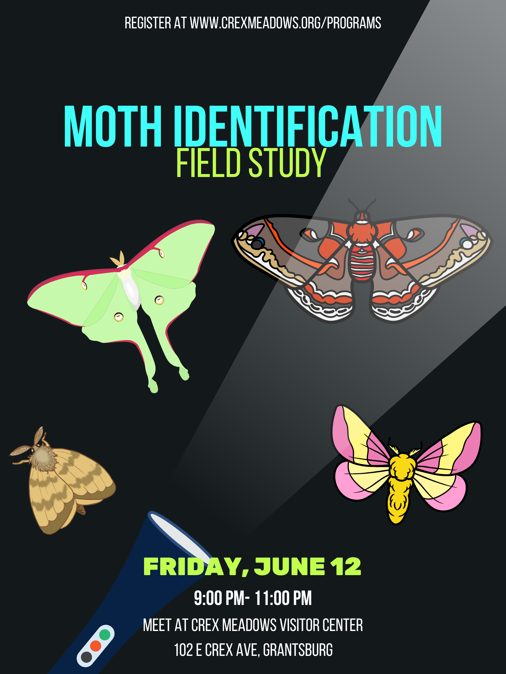 Crex Meadows Visitor Center 102 E Crex Ave, Grantsburg, WI, United StatesHead out into the field to observe and identify as many moth species as we can lure in! Recommended to bring: headlamp or flashlight, chair